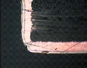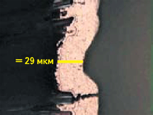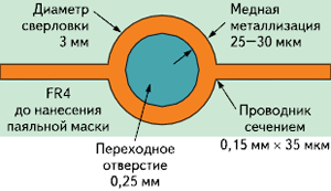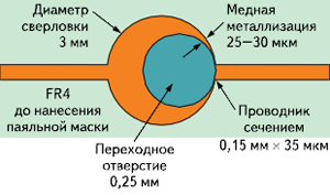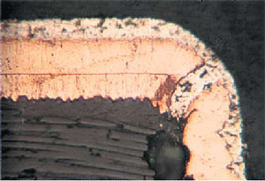 После выполнения сверловки отверстие может выглядеть, как на рис. 1, только при большом везении. Наиболее вероятно, что просверленное отверстие окажется расположенным, как показано на рис. 2. При этом образуется слабое место в области соединения проводника и площадки. Проходя весь производственный цикл, многослойная плата несколько раз подвергается нагреву. Одни из самых слабых мест конструкции ПП — соединения переходных отверстий с внутренними слоями (рис. 3). На рис. 5 можно видеть трещину металлизации на кромке металлизированного отверстия.