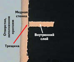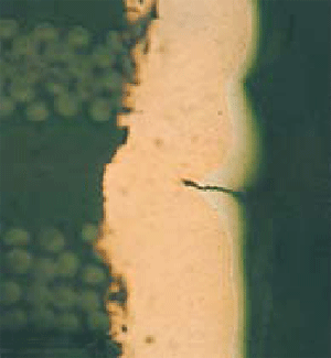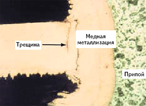 Разброс значений КТР (коэффициента температурного расширения) в большой степени зависит от того, из какого базового материала изготовлена ПП (стандарт IPC-4101C). Если плата подвергается множеству циклов изменения температуры, а базовый материал обладает большим КТР, возникает трещина в металлизации отверстия (рис. 4), подобная той, что показана на рис. 3.