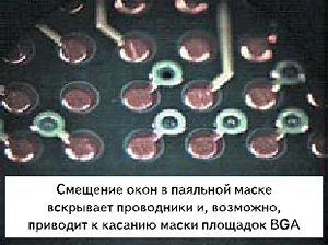 Электротестирование до нанесения финишного покрытия способно идентифицировать этот дефект как разрыв. В приведенном примере финишное покрытие было выполнено до электротестирования, плата его успешно прошла и была отгружена как качественная. При расширении применения компонентов с матричным расположением выводов и масштаба кристалла (BGA и CSP) со все меньшим шагом выводов совмещение паяльной маски становится сложной задачей (рис. 6). В приведенном выше примере паяльная маска близка к тому, чтобы закрыть часть площадки BGA, что может привести к проблемам пайки шариковых выводов из-за неплотного прилегания трафарета и «вычерпывания» паяльной пасты. Критерии приемки печатных плат в соответствии со стандартом IPC-A-600H-2010 Этот стандарт IPC описывает предпочтительные, допустимые и недопустимые явления, которые можно заметить на поверхности или внутри печатной платы. Примеры таких явлений показаны на рис. 1–5. Стандарт представляет визуальную интерпретацию минимальных требований, изложенных в различных стандартах по печатным платам, таких как серия IPC-6010 и стандарт J-STD-003B. Цель приведенных в стандарте наглядных иллюстраций — дать изображение для определенных критериев, относящихся к требованиям действующих стандартов IPC. Чтобы можно было корректно использовать этот стандарт и содержащиеся в нем сведения, печатная плата должна отвечать конструкторским требованиям подходящего стандарта серии IPC-2220 [1] и требованиям к параметрам ПП подходящего стандарта серии IPC-6010 [2]. Если печатная плата не отвечает данным или эквивалентным требованиям, критерии приемки должны основываться на договоренности между пользователем и поставщиком. Примеры, представляющие собой лишь малую часть содержания стандарта IPC-A-600H: